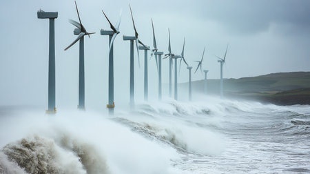 A row of wind turbines in a coastal area, generating electricity with ocean waves in the background -