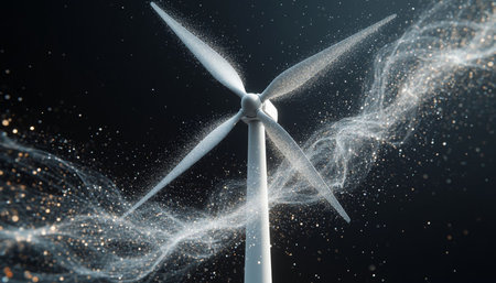 3d rendering wind turbine on dark background with particles, energy concept