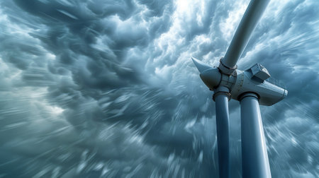 A wind turbine is shown in the midst of a stormy sky. Concept of power and energy, as well as the raw force of nature. The stormy sky and the spinning turbine blades create a dynamic