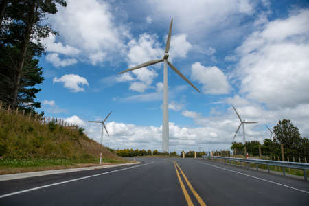 empty highway on wilderness and clean energy of wind power background