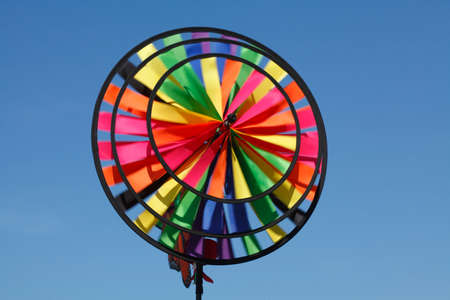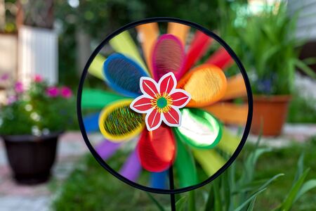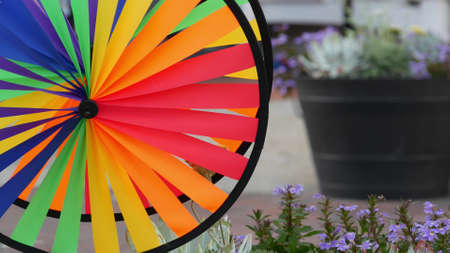 Colorful pinwheel spinning, weather wind vane, garden decoration in USA. Rainbow symbol of childhood, fantasy and imagination rotating. Multi colored spiral toy turning in breeze. Summertime dreaming.