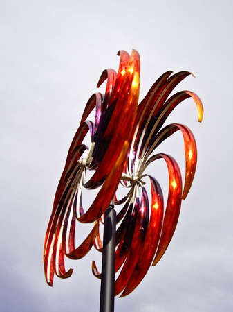 Red metal wind mobile twirls on stormy day