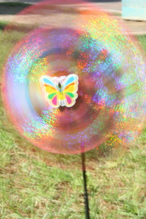 Colorful pinwheel spinning rapidly in the garden.