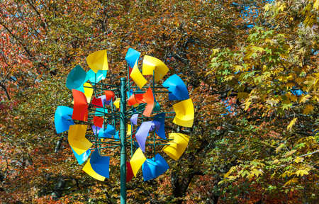 Colorful multicolored plastic wind turbine on trees background.