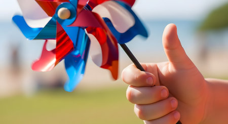 A close-up of a child's hand holding a red, white, and blue pinwheel toy. The pinwheel is spinning, and the background is a blurred, sunny beach or park. The image evokes feelings of childhood, play, summer, and patriotism (4th of July).