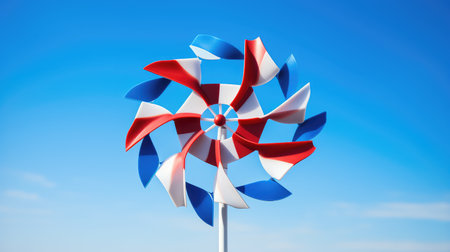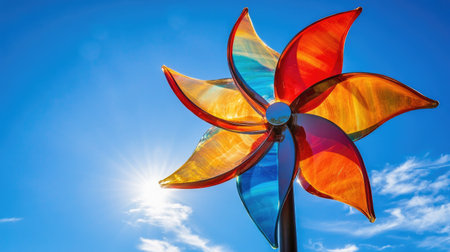 Beautiful multicolored pinwheel spinning gently in the wind against a warm summer sky, perfect for a playful outdoor scene