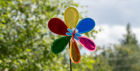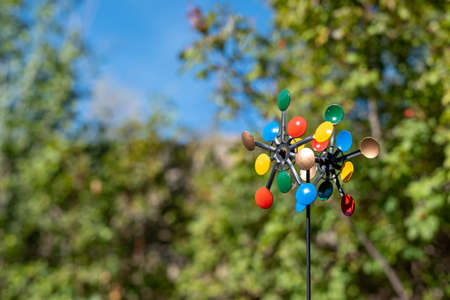Colorful wind lawn ornament with soft bokeh background.