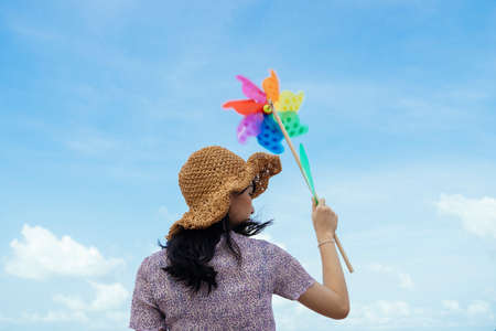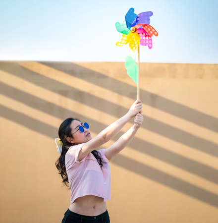 Asian woman posts and play Windmill Toy colourful rainbow colour on the building rooftop in sunset time.