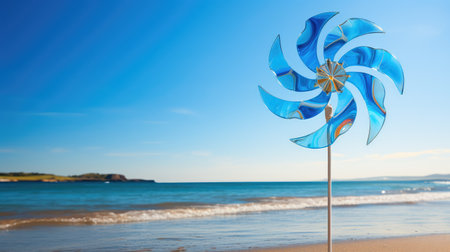 Rotating pinwheel on a sandy beach, symbolizing the joy of travel, beach tourism, and the simple pleasures of life.