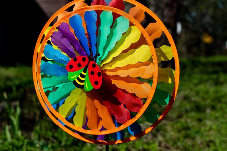 Colourful rainbow pinwheel in the garden.garden decor element pinwheel red ladybug on lawn background