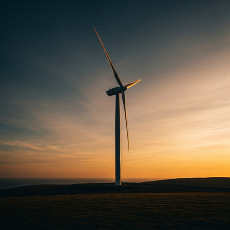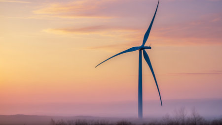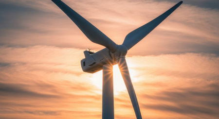 A striking wind turbine stands tall against a colorful sky at sunrise, symbolizing the power of renewable energy and the future of sustainable development.