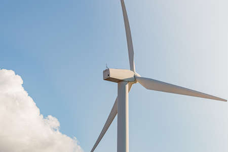 Close-up of a white wind turbine against a blue sky with clouds and copy space. Renewable energy concept.
