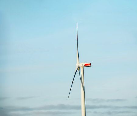 Rotating windmill generating renewable energy with wind power. Sustainability by windmills turbines preventing climate change with regenerative clean green nature energy. Windy blue sky with clouds