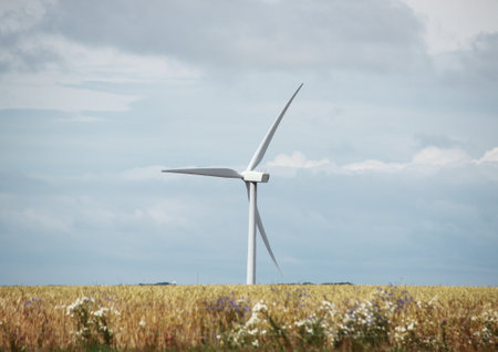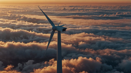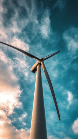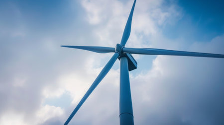 Wind turbine against a cloudy sky, renewable energy concept