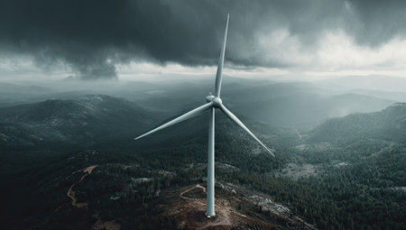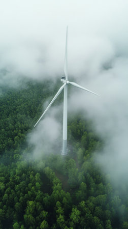 Wind turbine rising above a lush green forest enveloped in misty clouds. Renewable energy and sustainability concept