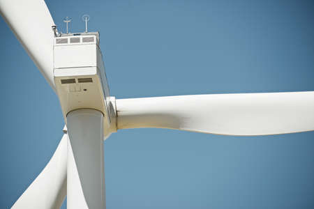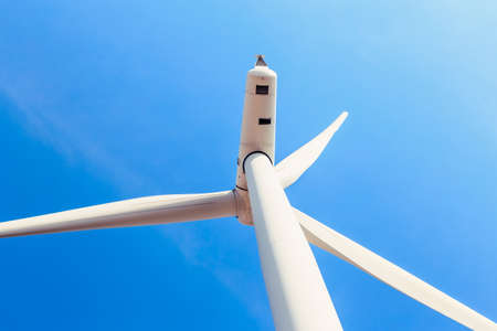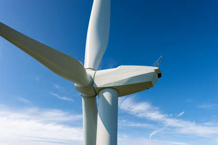 Wind power turbine against a blue sky background. White blades of a wind generator closeup. Renewable energy source. Powerful and ecological green energy concept