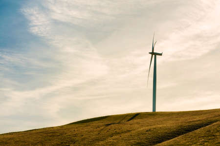 An image of windturbine generator on a hill at sunset