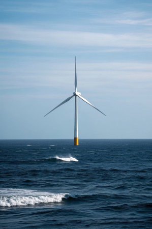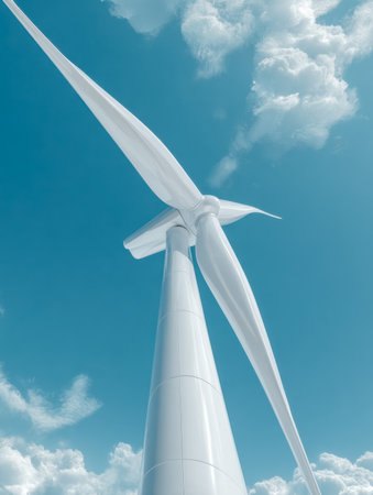 A sleek, contemporary wind turbine stands tall beneath a vibrant blue sky dotted with fluffy clouds, symbolizing clean energy and environmental harmony