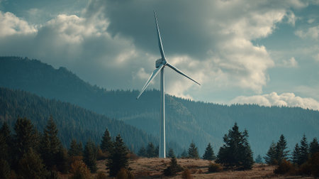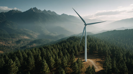 Serene view of wind turbine against mountainous backdrop with pine forest.