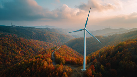 Wind Turbine Stands Tall Against Backdrop of Autumn Mountain Colors