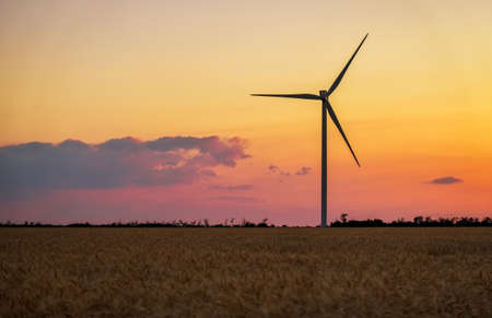 Wind turbine against a beautiful sunset sky in a rural landscape during twilight hours