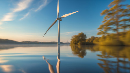 Turbine reflection on a calm lake during sunrise with greenery and clear skies