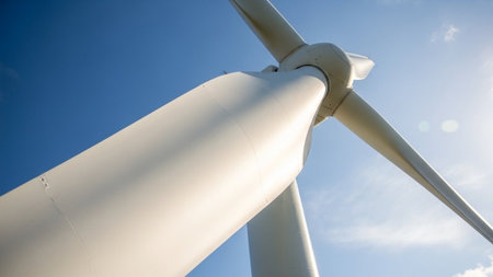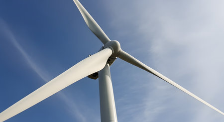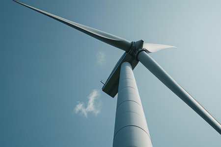 Close-up view of a wind turbine showcasing sustainable energy against a serene blue sky.