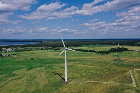 Windmills for electricity generation. Green energy concept. Background with copy space for text. Modern farm outside the city.