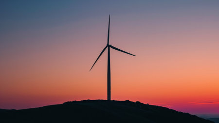 A wind turbine is standing on a hill in front of a beautiful sunset. Concept of peace and tranquility, as the wind turbine stands tall and proud against the backdrop of the colorful sky