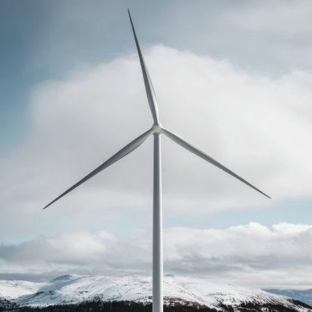A majestic wind turbine stands tall against a backdrop of snow-capped mountains and a dramatic sky, representing renewable energy solutions.
