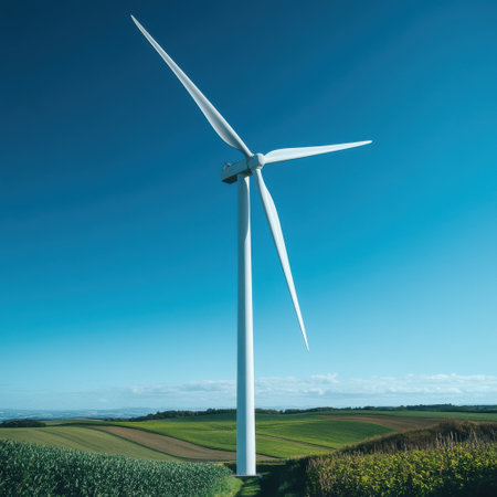 A tall wind turbine rotates gently in a vibrant green field. The clear blue sky enhances the tranquility of this rural setting during midday hours, showing renewable energy in action.