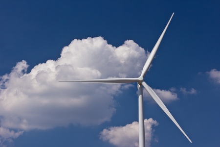 Big white windmills with cloud and blue sky.