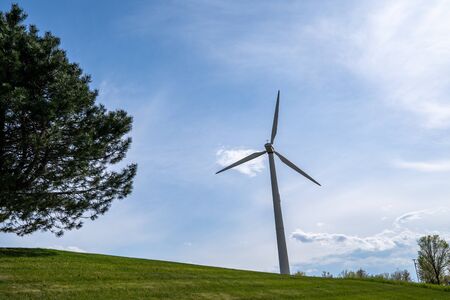 Wind turbine on hill generating electricity over a blue sky background. Clean and ecological energy production concept.