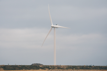Horizontal axis wind turbine with grey sky and clouds. Wind energy in eco wind farm. Green energy concept. Renewal energy. Alternative electricity source. Sustainable resources.