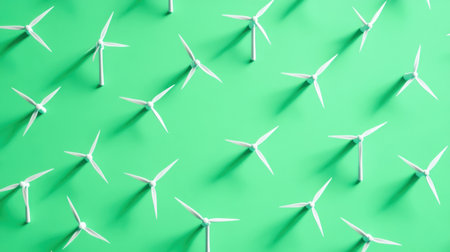 This image features a creative arrangement of miniature white wind turbines against a vibrant green background, symbolizing renewable energy and sustainability.
