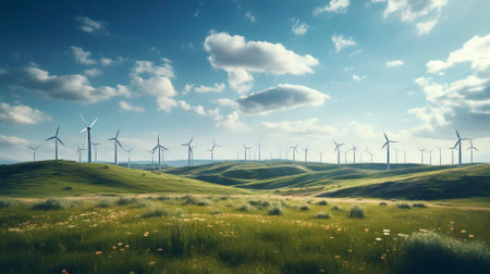 This serene landscape captures a vast expanse of green hills dotted with wind turbines under a bright blue sky, showcasing harmony between nature and renewable energy.