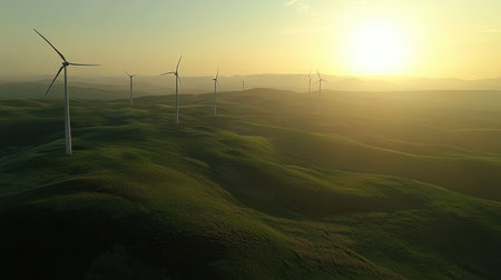 Captivating aerial view of wind turbines on green hills at sunrise, highlighting the beauty of renewable energy and serene landscapes in nature.