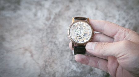 Time goes by: Man is holding a vintage watch in his hand, business context, copy space