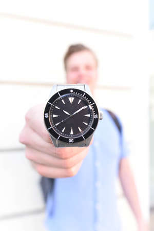 Hand showing wristwatch. fashion. Time
