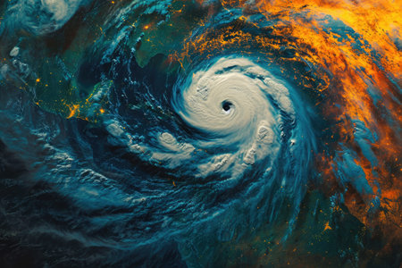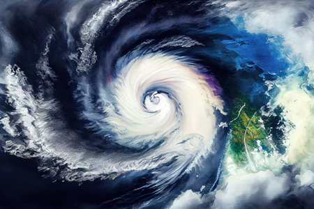 An Aerial view of hurricane eye swirling over ocean, showcasing turbulent clouds and environmental impact