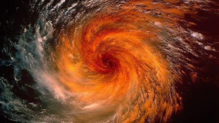 View from space from above on a hurricane tornado swirl of clouds and wind, a storm front of bad weather and natural disaster. AI generated.