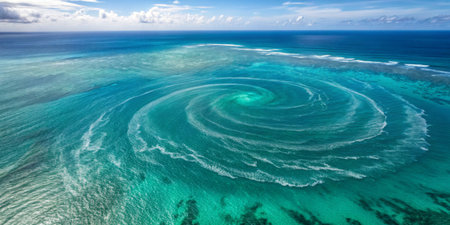 A magnificent whirlpool forms in the vibrant turquoise waters near a tropical coastline, showcasing the beauty of nature under a bright, clear sky with scattered clouds.