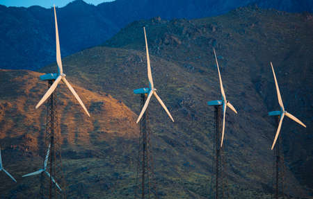 Wind Power Generation Using Wind Energy in Coachella Valley, California. Scenic Sunset. Green Power Industry Theme.