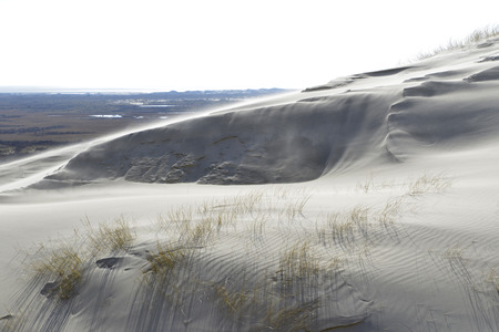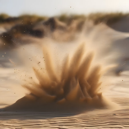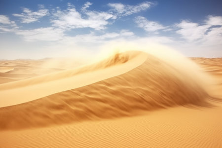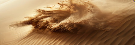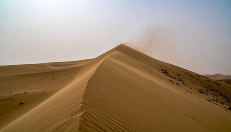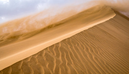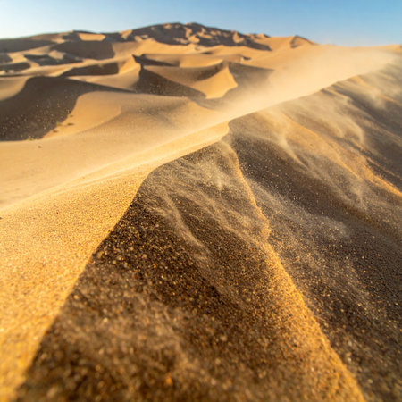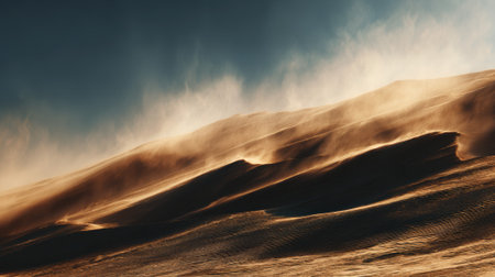 A sand dunes shifting in strong wind, dramatic sunlight, desert landscape, natural patterns