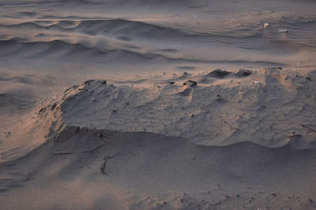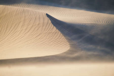 The sand dunes during sunset and strong wind. Summer landscape in the desert. Hot weather. Lines in the sand. Landscape without people.