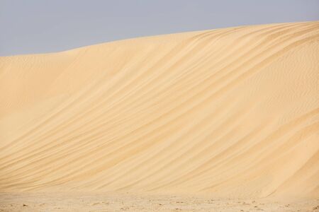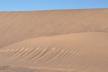Yellow sand dune in the desert closeup. Sand hill and blue sky. Natural sandy pattern. Sahara background