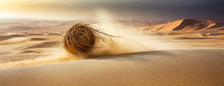 Tumbleweed rolling across a vast desert landscape during a sandstorm, illustrating the harsh and arid conditions of the environment
