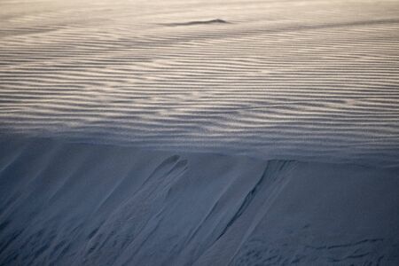 Sunset in the desert across a textured and patterned ridge with blowing sand making spectacular changing shapes. United Arab Emirates. Desert Concept.