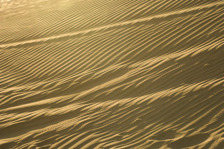 Close up of background texture of desert sand dunes. Beautiful structures of sandy dunes on sunny summer day. Annual growth of area of sand with wave from wind in desert for holiday vacation concept