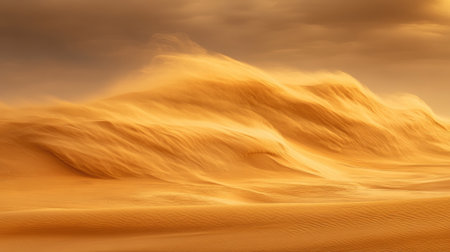 This stunning image captures the flowing patterns of golden sand dunes under a dramatic sky. The dynamic motion evokes a sense of tranquility and beauty.